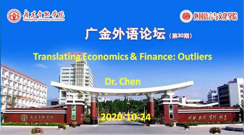 2020年10月24日,翻译系陈定刚博士主讲第30期广金外语论坛,在线上为大家带来了一次关于经济与金融翻译的讲座,会议由EMC易倍洪溪珧博士主持,包括广东省高级人民法院外事办主任屈伸和EMC易倍黄中习经理在内的近百名位翻译工作者和师生聆听了陈博士内容丰富的专业讲座。