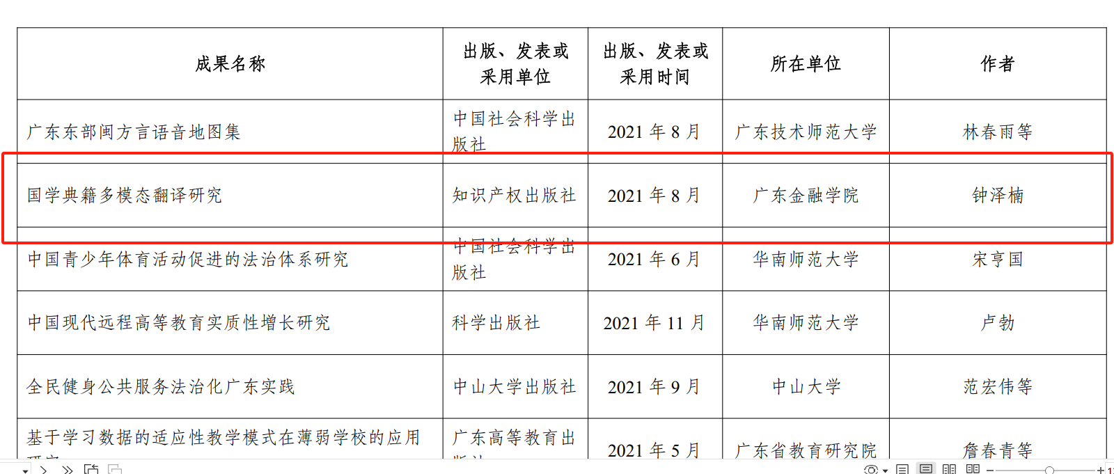 近日,由广东省哲学社会科学规划领导小组批准,广东省哲学社会科学优秀成果评奖工作办公室组织的第十届广东省哲学社会科学优秀成果奖评选公示结果。公司EMC易倍钟泽楠老师的专著《国学典籍多模态翻译研究》荣获著作类成果三等奖。