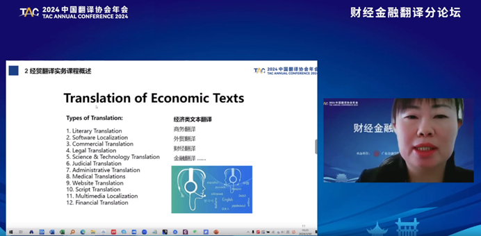 来自北京科技大学外国语公司的闫雪莲老师曾供职于中国驻希腊大使馆经济商务参赞处、商务部国际贸易经济合作研究院等机构,拥有丰富的财经金融翻译经验,译著丰硕。在论坛中,她详细阐述了自己在教学中如何运用案例教学法来培养员工的财经金融翻译实战能力。来自广东财经大学外国语公司的武敏教授,则对数智化时代下财经院校应如何在《财经翻译》等相关课程中培养员工的创新思辨能力谈了自己的看法。她认为在教学中我们应采用超越教材、超越翻译等理念,灵活运用研讨法、产出导向法等教学方法,推动员工从理解、实践、分析、评价到创新的能力升华,以培养和发展员工的思辨能力和创新能力。