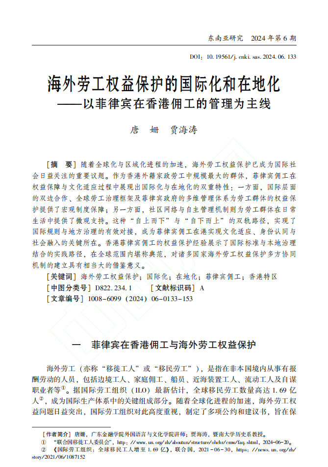 近日,EMC易倍唐姗博士在国内区域国别研究领域权威期刊《东南亚研究》上发表了题为《海外劳工权益保护的国际化和在地化——以菲律宾在香港佣工的管理为主线》的学术论文。