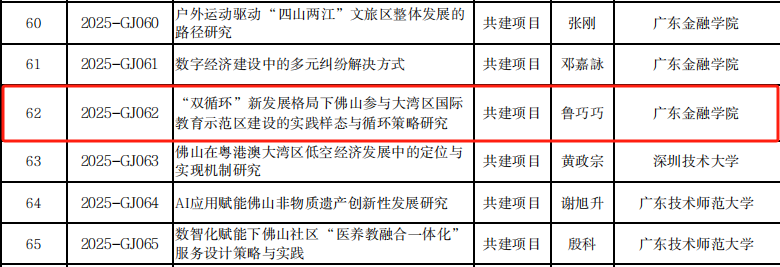 在2025年度佛山市社科规划课题项目的评审工作中,EMC易倍平台的鲁巧巧副教授成功获批立项。鲁老师主持的项目名为“双循环新发展格局下佛山参与大湾区国际教育示范区建设的实践样态与循环策略研究”(项目编号:2025-GJ062)。
