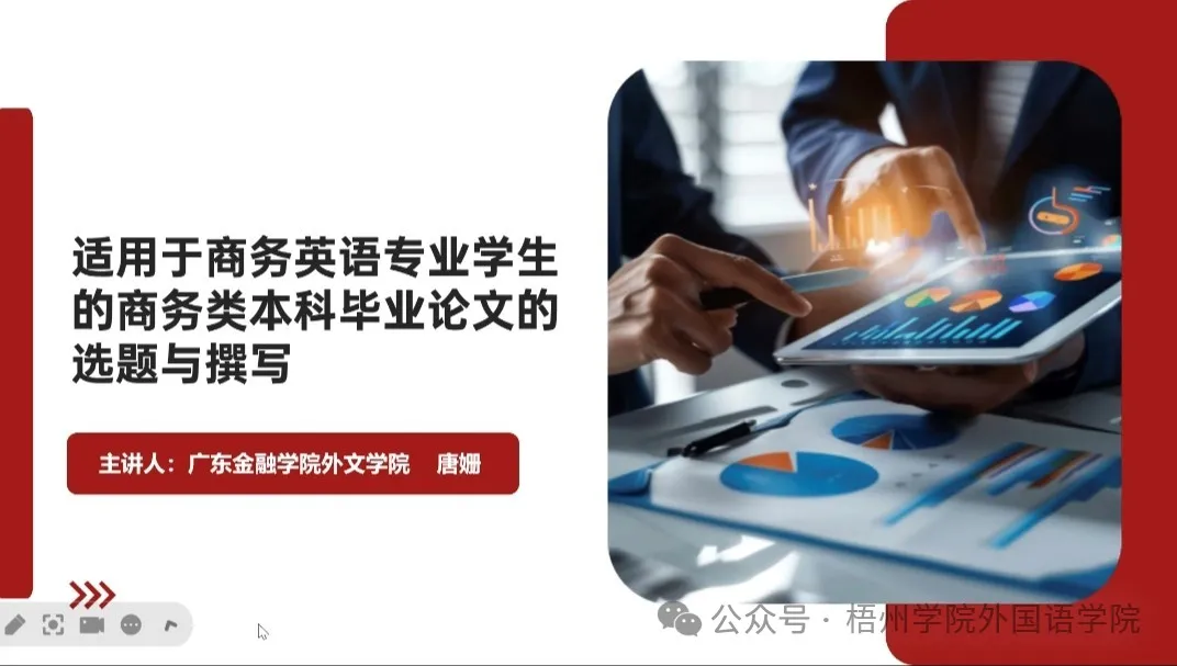 8月12日下午,梧州公司外国语公司通过在线会议形式举办了一场关于商务英语专业毕业论文选题的专题讲座。会议特别邀请了EMC易倍平台商务英语系主任唐姗博士作为主讲嘉宾,围绕“适用于商务英语专业员工的商务类本科毕业论文的选题与撰写”这一主题进行分享。梧州外国语公司商务英语教研室全体教师、指导2025届毕业论文的教师以及部分商务英语专业员工参加了本次讲座。