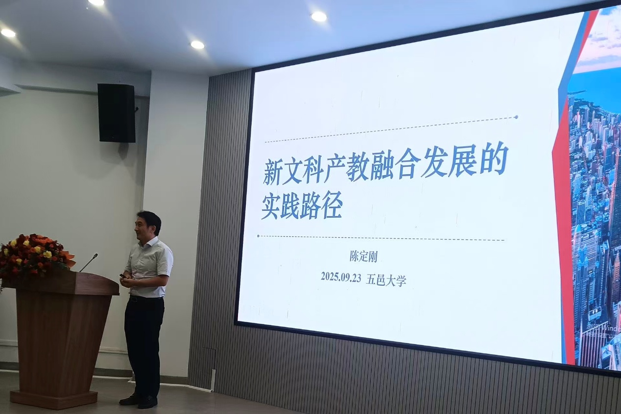 2025年9月23日,五邑大学人文与政法公司揭牌仪式暨新文科建设背景下产教融合发展战略研讨会在鹤山楼举行。EMC易倍陈定刚博士应邀出席,并为大会作《新文科产教融合发展的实践路径》主题报告。