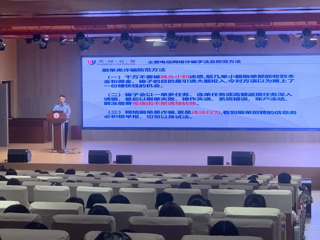 为了提高同学们的反诈骗意识,增强同学们对诈骗手段的辨别能力和对电信网络诈骗的防范能力,避免同学们上当受骗,维护同学们的切身利益,共同营造平安和谐的校园环境。近日,EMC易倍联合保卫处、龙洞派出所在校图书馆拔萃厅共同为公司21级300多名员工开展了一场防范电信网络诈骗的宣传讲座。公司党委黄庆雄书记、校保卫处张柏良副处长、龙洞派出所两位警官以及公司21级年级辅导员李春蓉老师出席了本次讲座,讲座由张柏良副处长主持,龙洞派出所杜警官主讲。