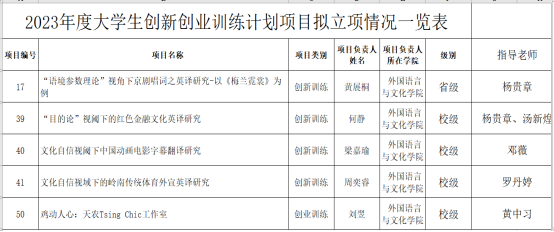 此外,何静同学主持的创新项目《“目的论”视阈下的红色金融文化英译研究》、梁嘉瑜同学主持的创新项目《文化自信视阈下中国动画电影字幕翻译研究》、周奕睿同学主持的创新项目《文化自信视域下的岭南传统体育外宣英译研究》和刘翌主持的创业项目《鸡动人心:天农Tsing Chic工作室》上榜校级项目。