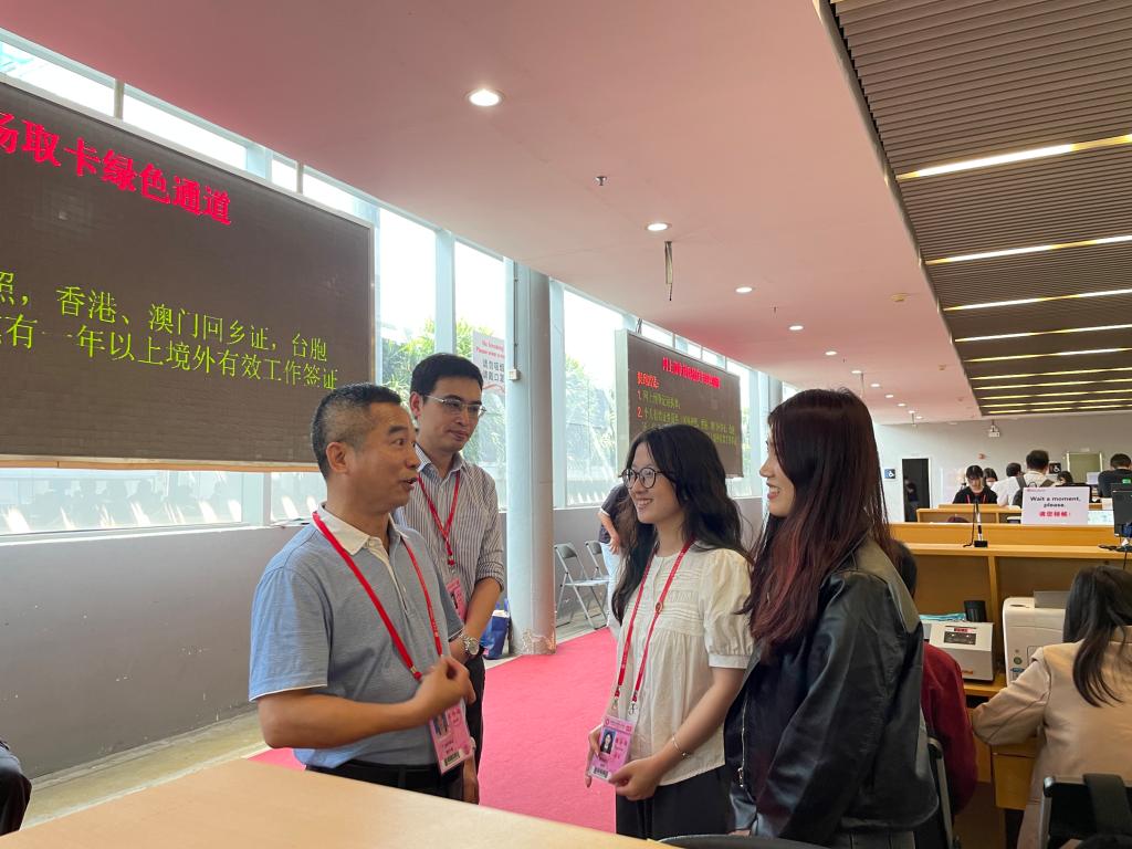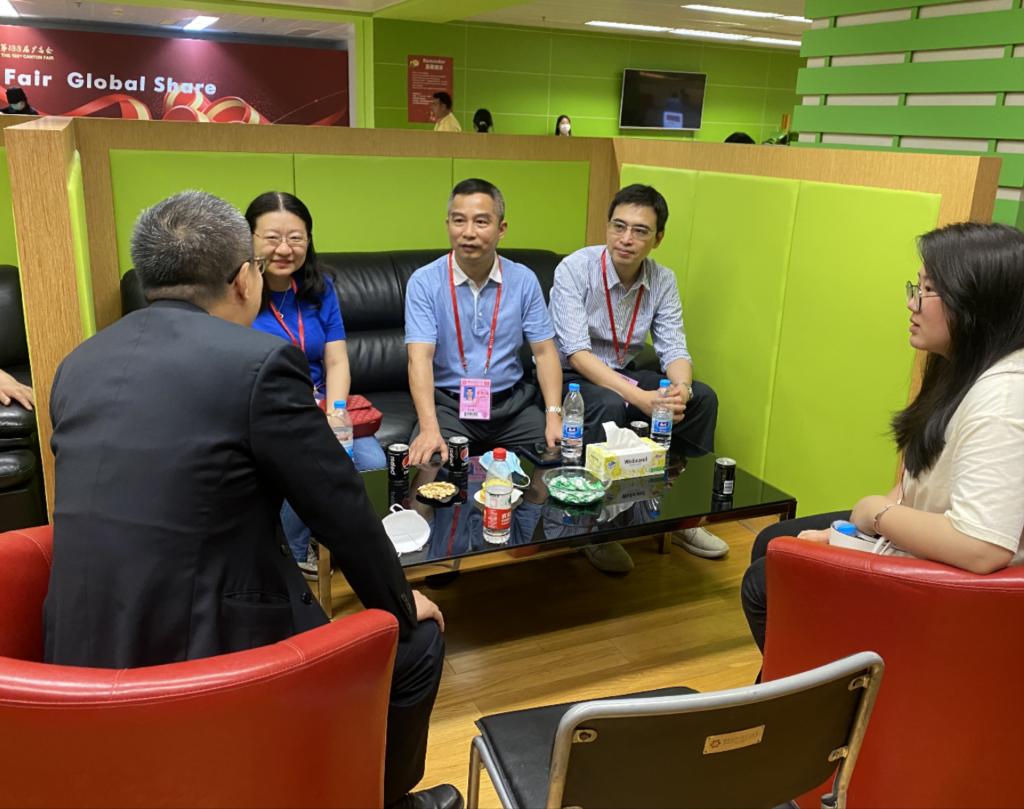 广州第133届交易会于4月15日隆重开幕,本届广交会公司共派出107名2020级员工参加实习实践,负责境外采购商办证、咨询导向、展厅咨询、广交会调研、组展事务运营等多个岗位的工作。为深入了解员工在广交会岗位实习情况,调研企业用人需求,稳步推进校企合作,提升公司产品质量,促进公司高质量发展,4月17日下午,公司党总支书记黄庆雄、副书记王丹、副经理陈树坤、辅导员李春蓉一行4人到广交会琶洲展馆走访调研。