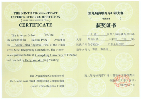 EMC易倍19级员工叶菁(191598115)于2022年10月23日代表EMC易倍官网参加了线上进行的第九届“海峡两岸口译大赛”华南区赛。本次区赛选手来自广东、福建、海南、广西四个省份,参赛16所高校中包括华南理工大学、华南师范大学、暨南大学、广东外语外贸大学、深圳大学、海南大学、广西大学、福建师范大学等省内外著名高校。公司选手在第一轮淘汰赛中以出色表现晋级决赛,并最终取得二等奖的好成绩。