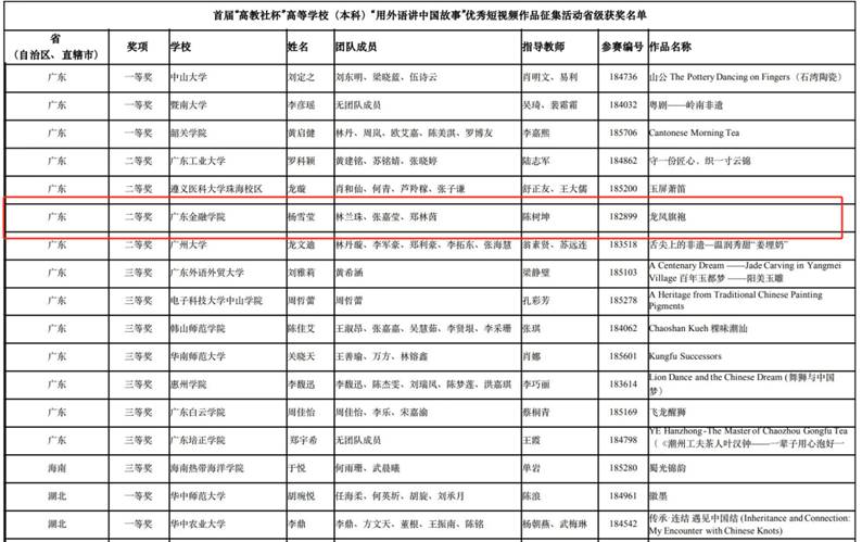 近日,由南京大学联合高等教育出版社举办的首届“高教社杯用外语讲中国故事”高等公司(本科)优秀短视频作品征集活动结果揭晓,公司陈树坤老师指导的员工团队杨雪莹、张嘉莹、郑林茵、林兰珠共同创作的《龙凤旗袍》荣获广东省二等奖。