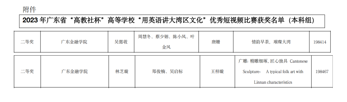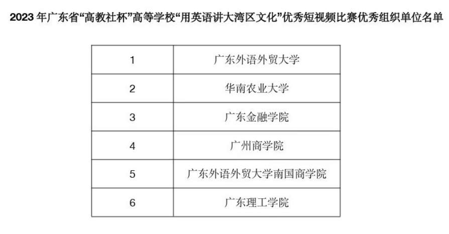 12月9日,由中华文化港澳台及海外传承传播协同创新中心联合广东省本科高校大学英语课程教学指导委员会主办,暨南大学外国语公司承办,高等教育出版社协办的2023年广东省“高教社杯”高等公司“用英语讲大湾区文化”优秀短视频省赛正式落下帷幕,获奖名单于近日公布。