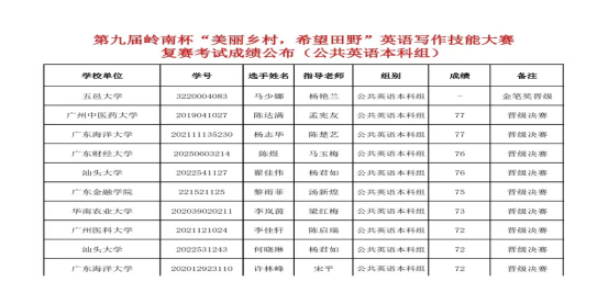 由广东省本科高校外语类专业教学指导委员会、广州外国语协会与外研在线联合举办的广东省第九届岭南杯“美丽乡村,希望田野”英语写作技能大赛分三个阶段举行,初赛由参赛公司自行组织,复赛于2023年5月13日通过线上平台进行, 决赛于 2023 年 5 月 20 日线下举行。比赛分四个组别:公共英语专科组、公共英语本科组、专业英语专科组和专业英语本科组。