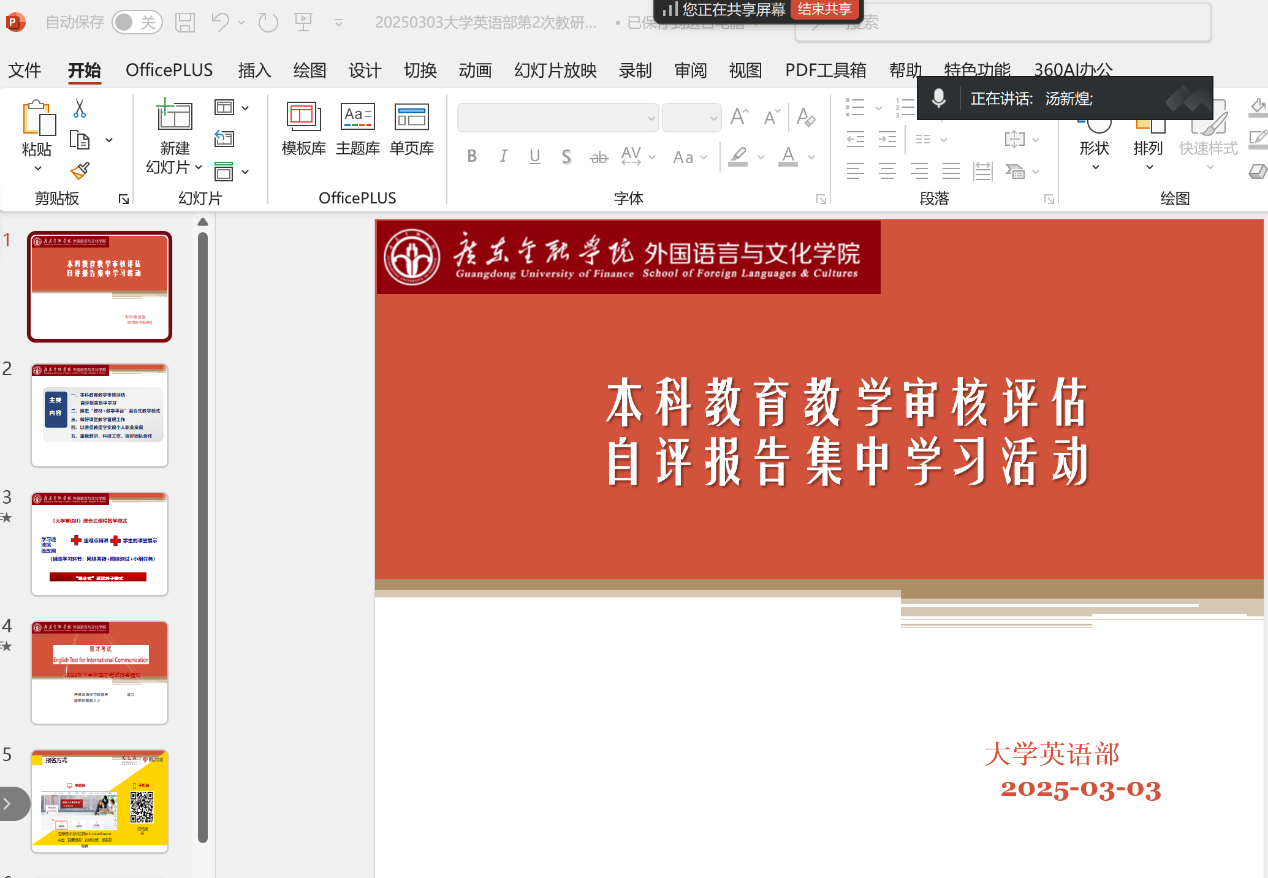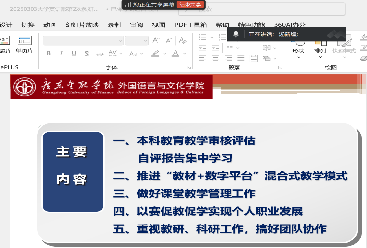 为了深化本科公司产品改革,扎实推进审核评估工作,外国语文化公司大学英语部于2025年3月3日晚线上组织本科公司产品审核评估自评报告集中学习活动。副经理甘容辉主持,EMC易倍副经理、大学英语教研主任及全体教师参加。