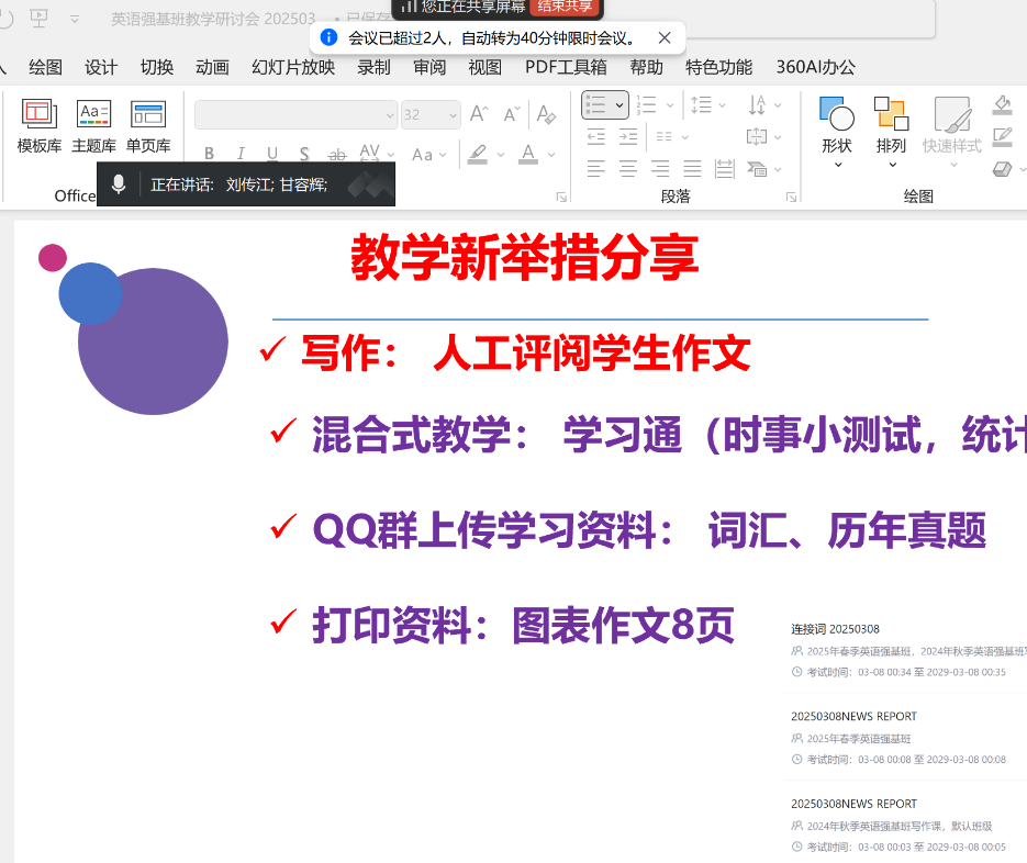 2025年3月10日晚,EMC易倍英语强基班任课教师线上举行新学期第一次教研会议。本次会议围绕教学模式创新、精品课程建设、师生交流等议题展开,旨在进一步提升教学质量,助力员工成长成才。